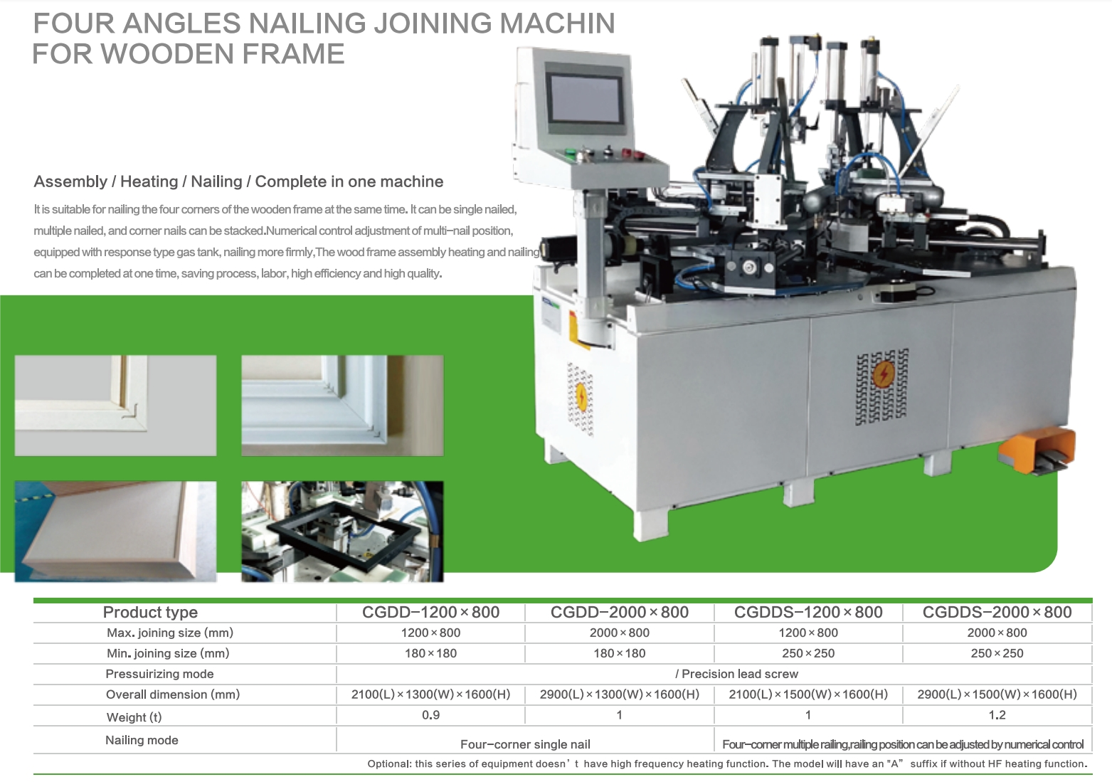 This machine is engineered for simultaneous nailing of all four corners of wooden frames. It supports both single and multiple nails per corner, ensuring strong, consistent joints. Equipped with a precision lead screw system and gas-powered response tank, the machine guarantees firm, high-speed nailing with excellent accuracy.