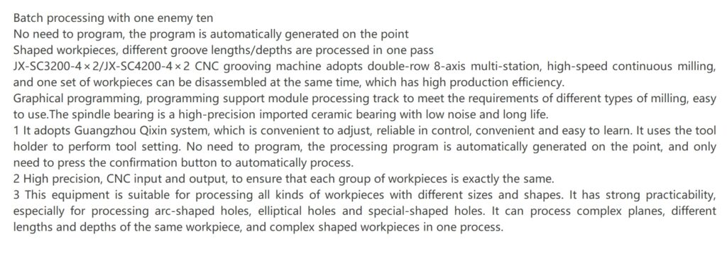 The JX-SC4200-4×2 and JX-SC4200-5×2 CNC grooving machines are designed for batch processing of workpieces with high efficiency. These machines use double-row 8-axis multi-station continuous milling, allowing for simultaneous processing of multiple workpieces, increasing productivity significantly.