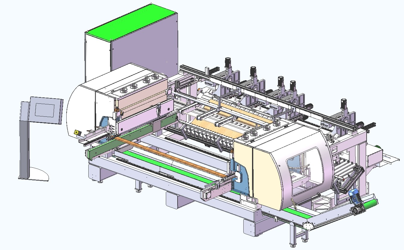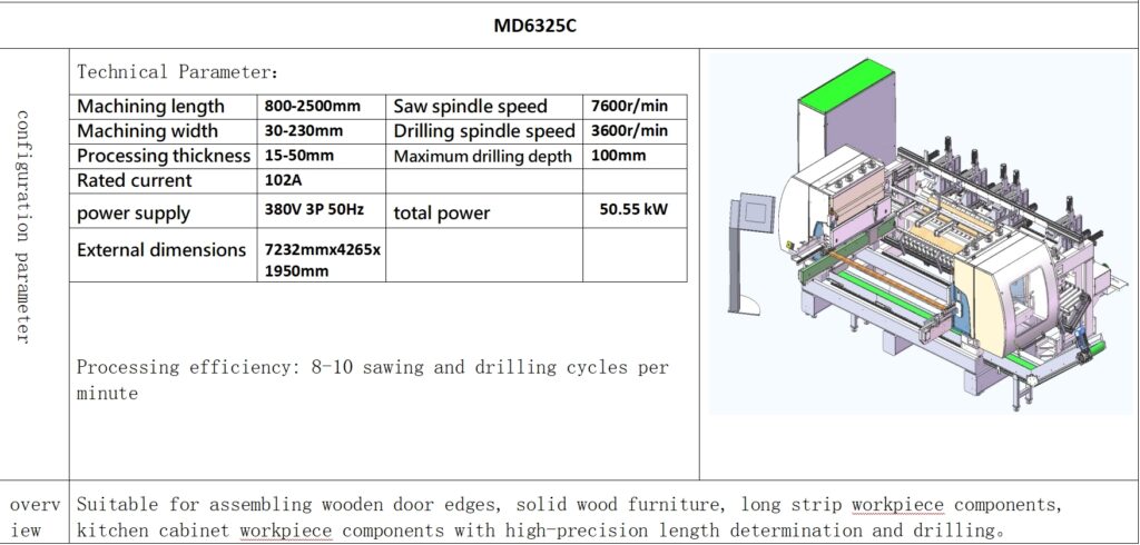 The MD6325C is an advanced double-end sawing and drilling solution designed for high-efficiency woodworking. It integrates length detection, precise sawing, and drilling operations in one machine, achieving 8–10 cycles per minute.