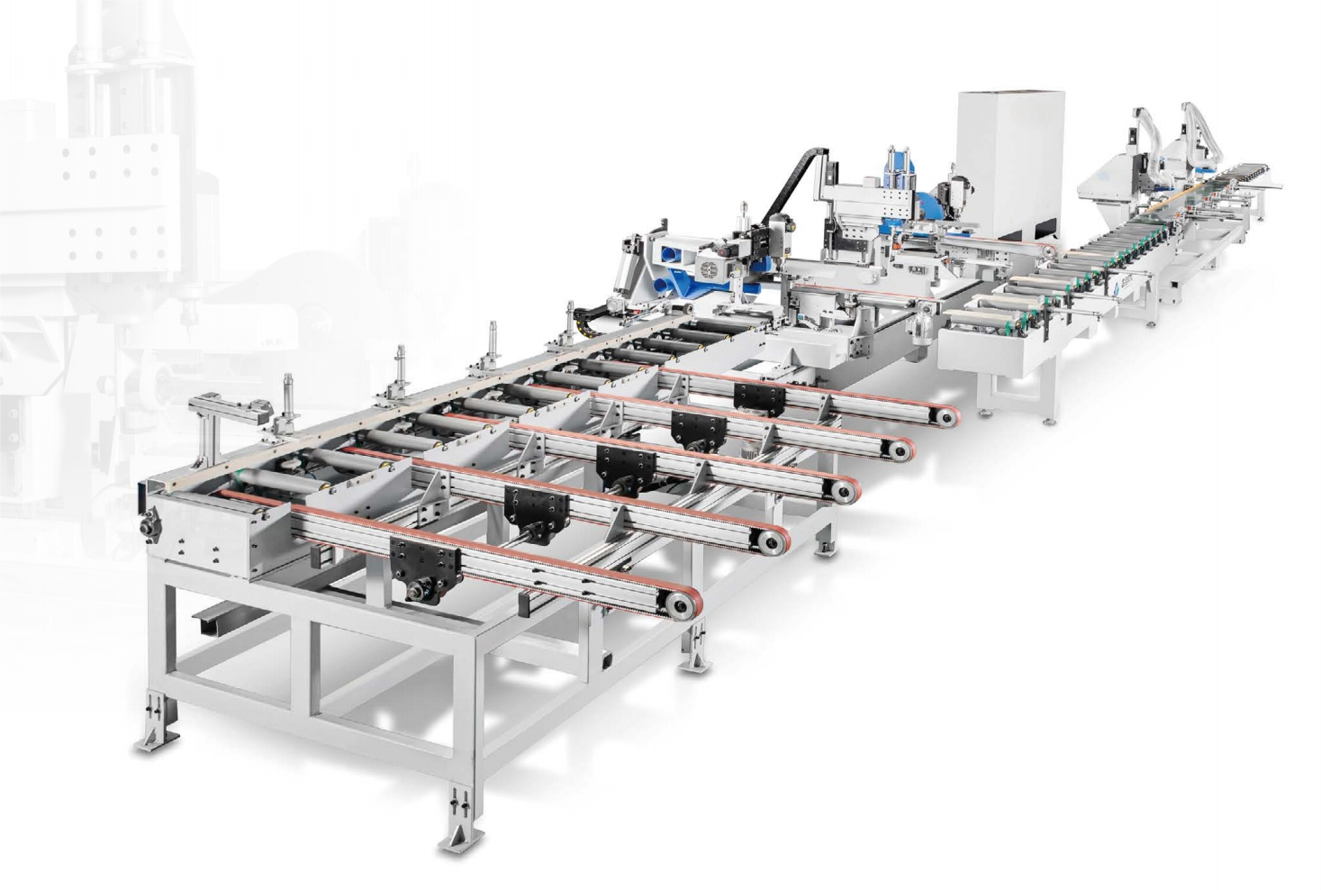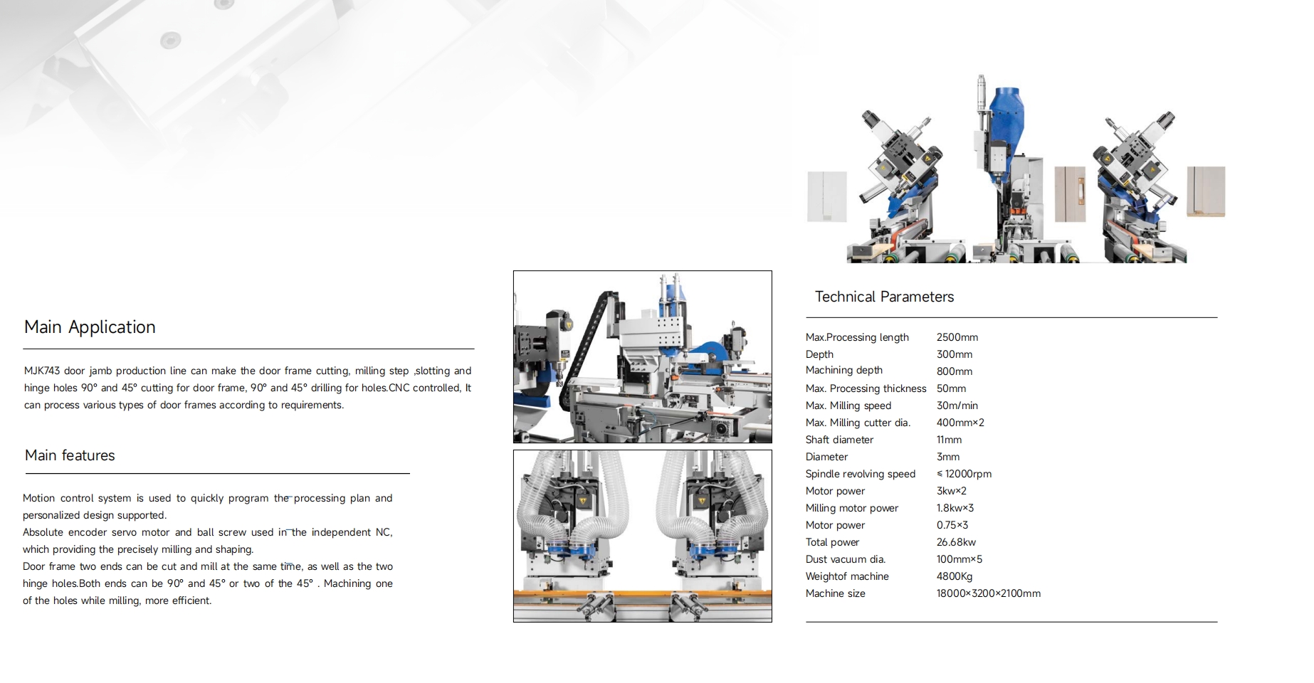 The MJK743 is a CNC-controlled door jamb production line designed for precision milling and drilling. It enables 90° and 45° cutting for door frames and hinge holes, supporting multi-angle processing requirements. Ideal for high-efficiency door frame manufacturing with automated programming and servo control.