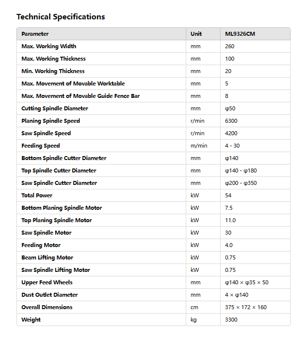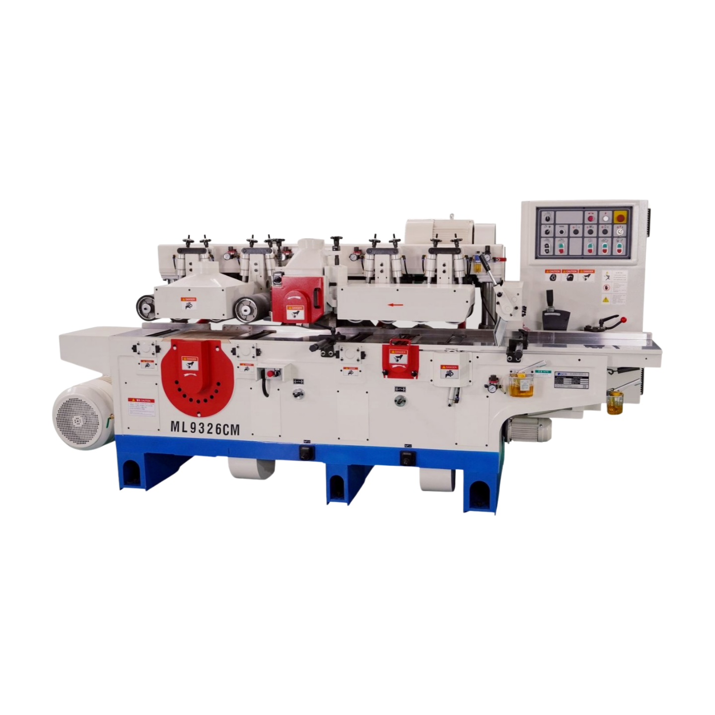 The ML9326CM is a high-efficiency woodworking machine that integrates four-side planing and multi-blade sawing in one operation. It is designed for precise thickness calibration and efficient cutting, making it ideal for large-scale wood processing and furniture production.