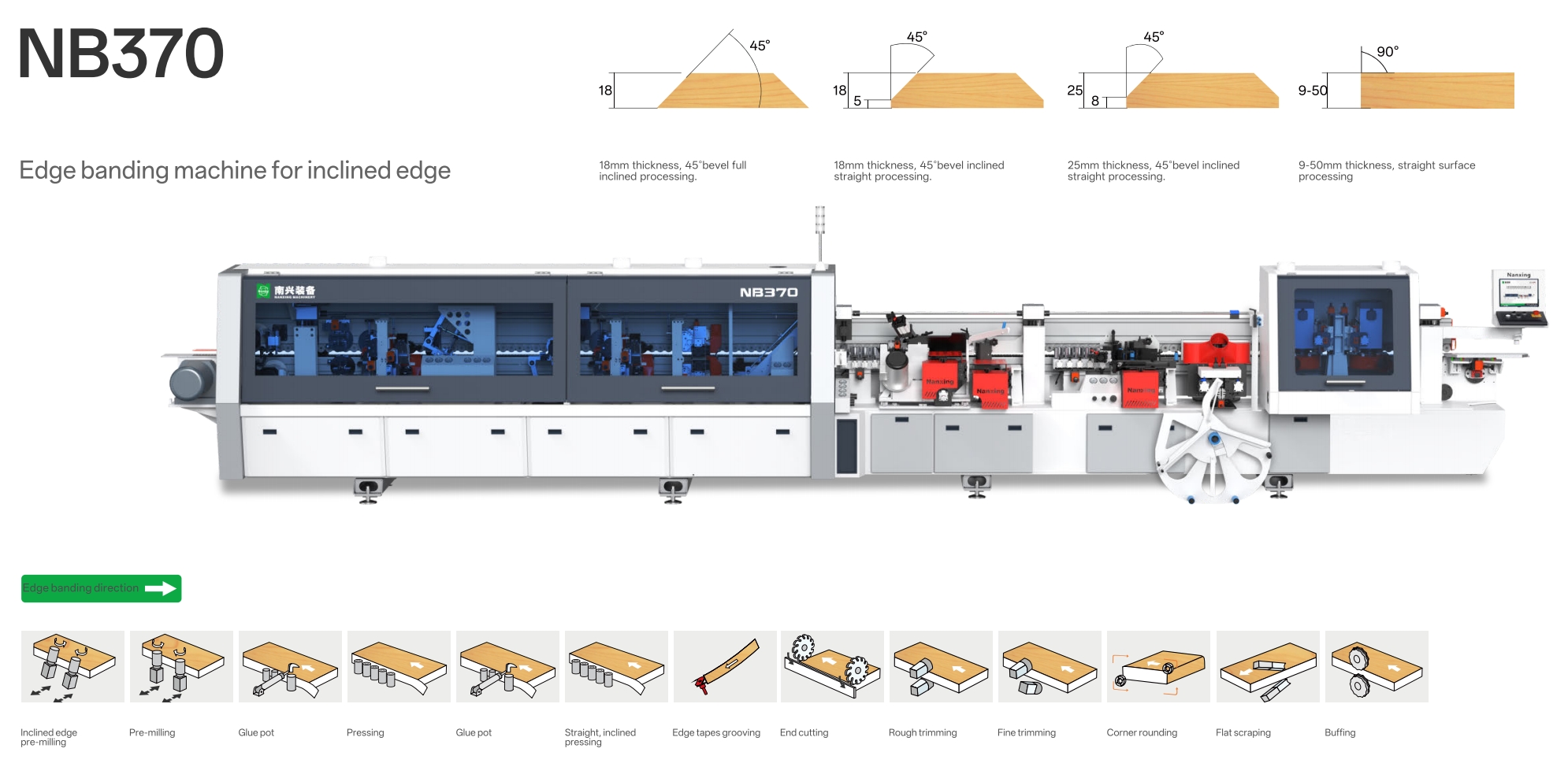 Supports both straight edge (9–50mm thickness) and inclined edge (15–25mm thickness) banding in one system. -