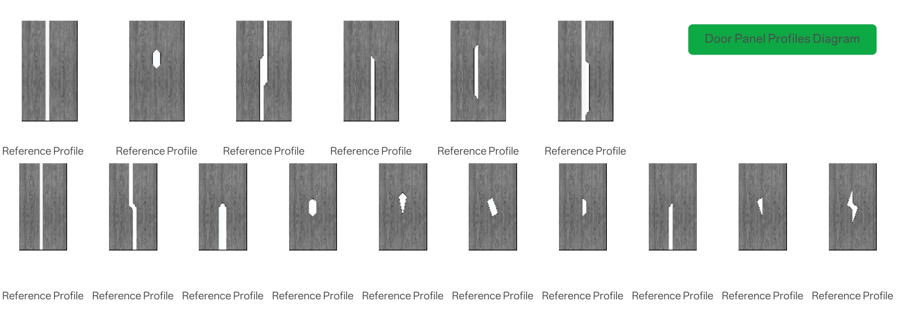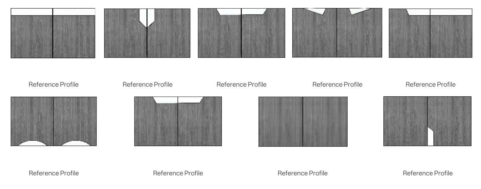 Capable of processing dozens of reference profile types as shown in the door panel diagram, including straight-line, V-groove, diamond-cut, and wave contours.