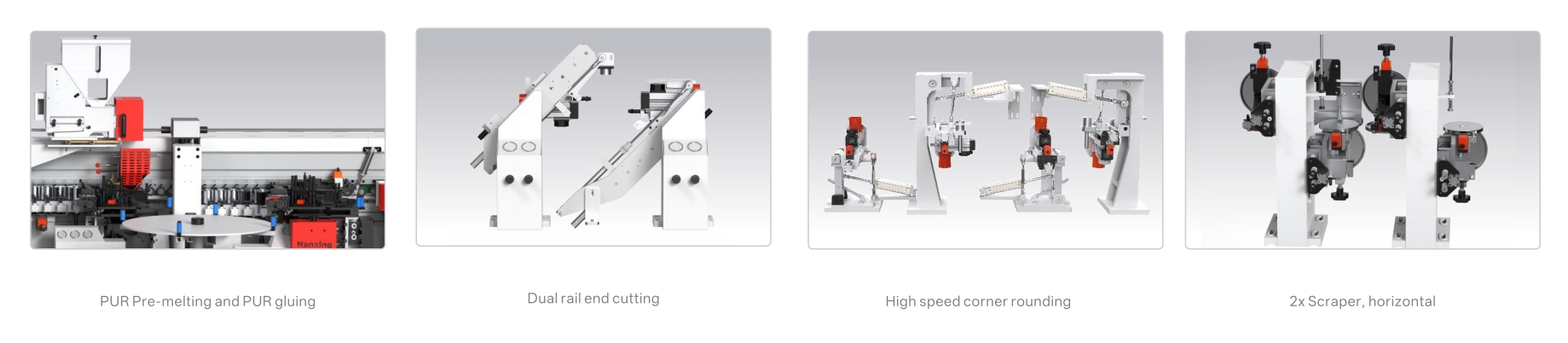 Equipped with pre-milling, pre-melt station, dual pressing, servo-controlled dual rail end cutting, rough and fine trimming, high-speed corner rounding, dual horizontal scraping units, flexible flat scraping, off-cut removal, and dual buffing. -