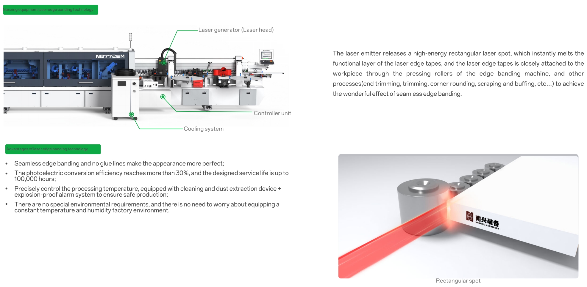Laser emitter produces a high-energy rectangular beam that melts the adhesive layer of laser edge tapes, achieving perfect adhesion without visible glue lines. -