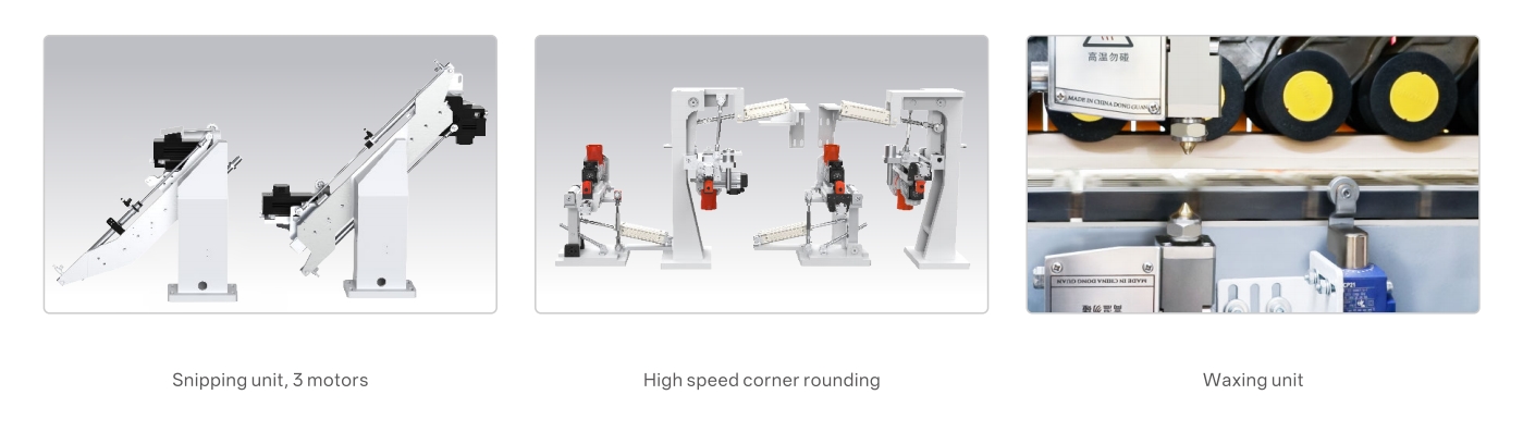 Fully equipped with pre-milling, PUR gluing, dual-stage pre-melting, servo tape feeding, pressing units, 3-motor snipping, rough and fine trimming, high-speed corner rounding, off-cut, scraping, waxing, and dual buffing — all in one continuous workflow. -