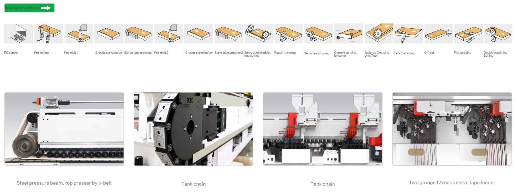 Includes pre-milling, dual pre-melting stations, servo-controlled tape feeders, rough/fine trimming, corner rounding, servo grooving, scraping, and double buffing — offering complete edge processing in a single pass. -