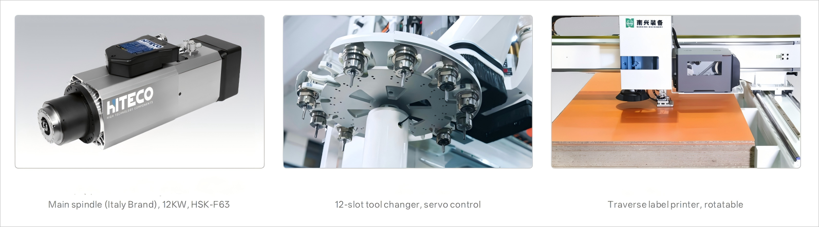 12kW HSD spindle (Italy, HSK-F63): High-performance cutting for smooth edges and stable processing.