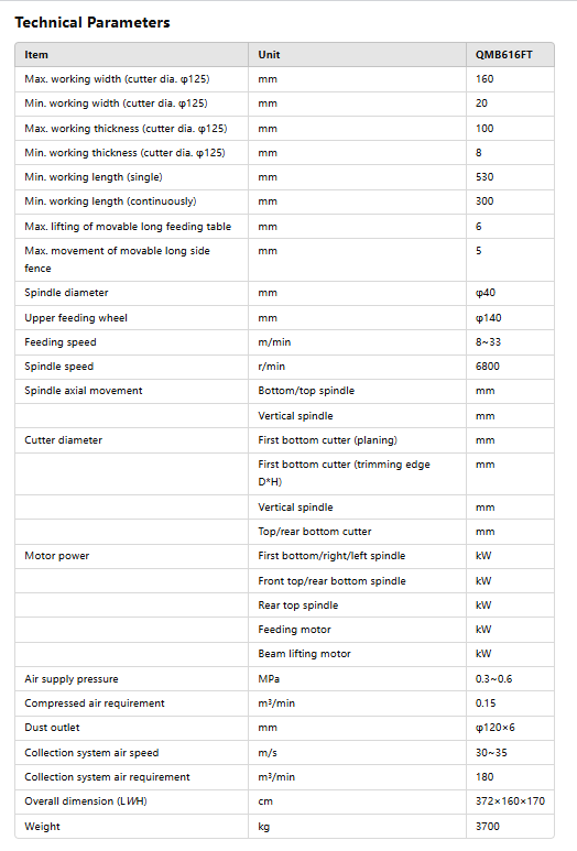 The QMB616FT Four-Side Planer is a high-performance woodworking machine designed for precision machining of wood surfaces. This model provides stable and efficient operation, making it ideal for mass production and custom wood processing.