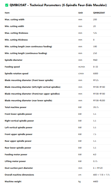 With a total power of nearly 40 kW and individual spindle motors up to 7.5 kW, the QMB620AT is built for demanding, long-term operation. -