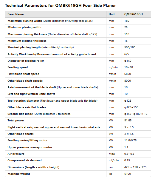 The QMBK618GH Four-Side Planer is a high-performance woodworking machine designed for precision planing and processing of wood surfaces. Equipped with high-speed blade shafts, adjustable feeding rollers, and powerful motors, this machine ensures efficient and accurate operation for woodworking industries.