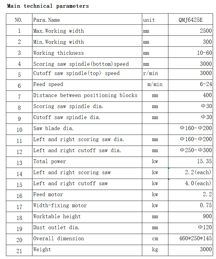 The QMJ6425E is a double-end cutting and grooving machine designed for high-efficiency panel processing in woodworking industries. It features stable feeding, precise cutting, and powerful dual saw systems—making it ideal for solid wood furniture, flooring, and door panel production.