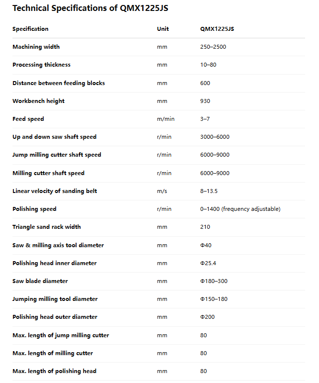 Designed with high feed speed (3–7 m/min) and servo-driven pressure belts, the QMX1225JS is perfect for automated production lines in large factories.